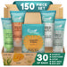 - 150 Pieces IN THE BOX: This 150 piece mini toiletries set has everything you need to keep your guests comfortable. Your hotel kit includes 30 of each: Shampoo, Conditioner, Lotion, Body Wash & Soap Bar. Naturally scented with white tea, honey & chamomile for an invigorating & refreshing scent!