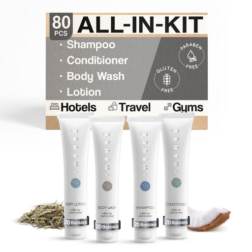 Original price $79.99 - Original price $79.99Original price$79.99$79.99 - $79.99Current price $79.99| /Infuse Pure White Tea and Coconut Hotel Soaps and Toiletries Bulk Set | All-In-Kit for Hotels | 1oz Shampoo & Conditioner, Body Wash & Lotion| Travel Size 80 Pieces